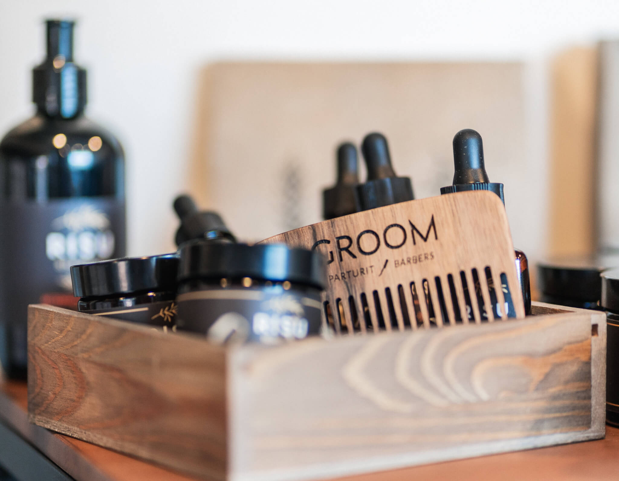 We offer all professional barber services from haircuts to American shaves in our shops. All our services include coffee or tea and all haircuts include a wash with a relaxing massage. Naturally we also have the best assortment of quality hair and beard products from brands like BRBR, Pomp&Co., Pusher and Risu Brand.